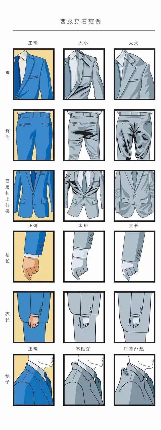 因此,西裝最重要的就是合體,不合體的西裝帶給你的只有缺乏品位和不專業(yè)。因此一套合適的西裝應該如下圖所示: